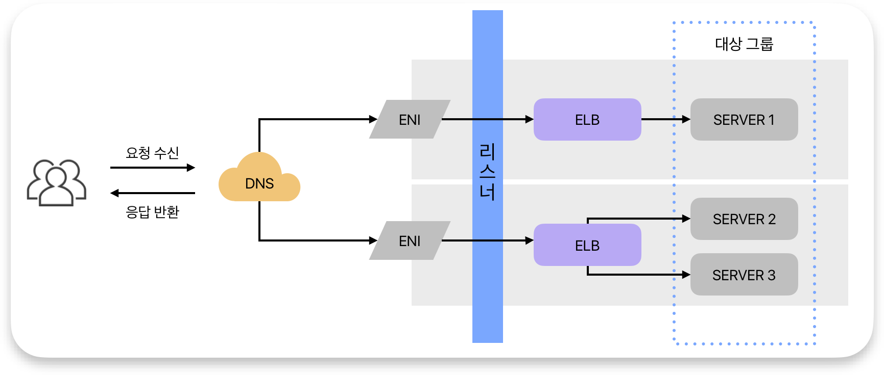 - 각 대상 그룹은 로드 밸런싱 정책에 따라 요청을 처리한다. (Ex. 라운드 로빈, 최소 연결 방식 등)