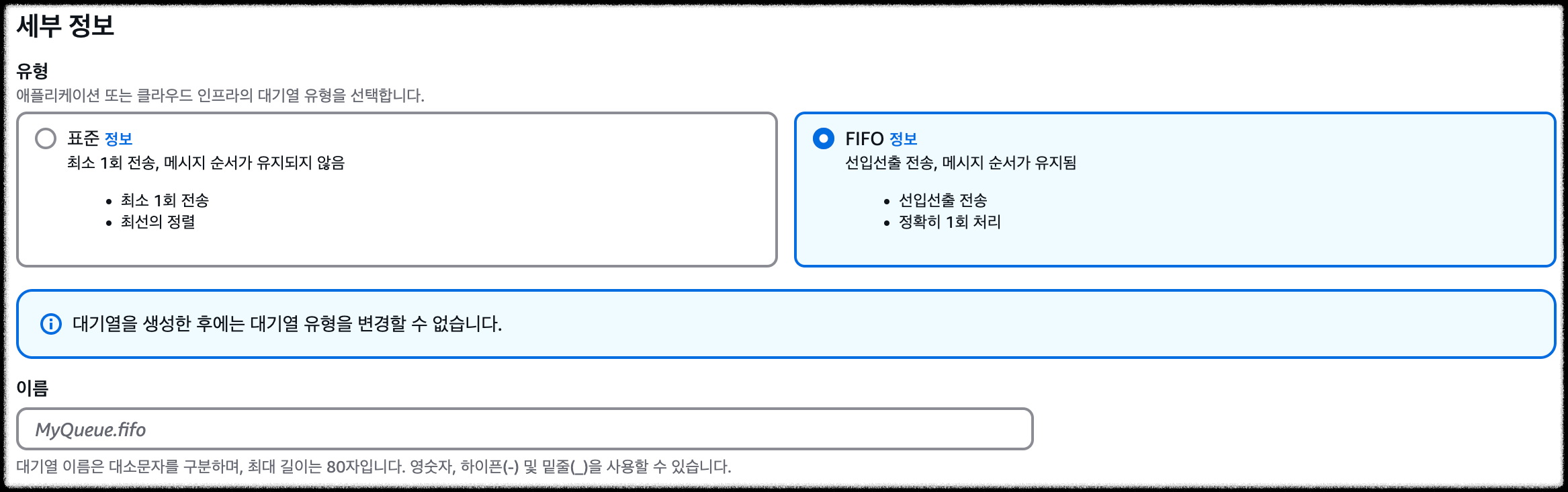 - 메시지를 무조건 1회 처리해야 하기 때문에 FIFO 선택