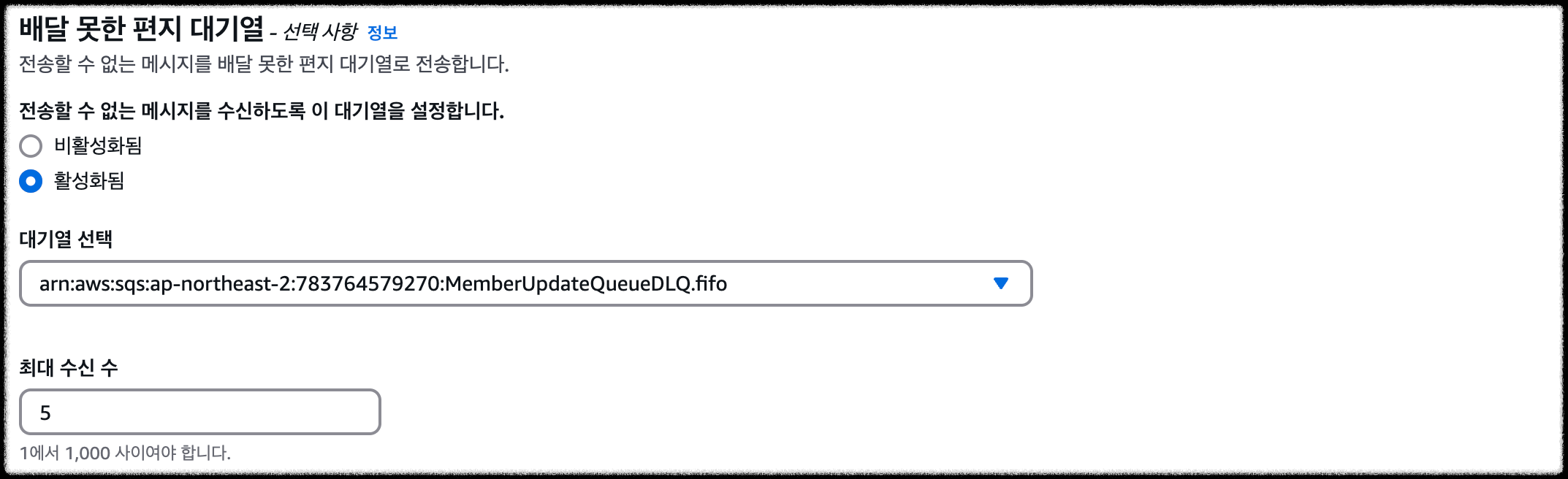 - 기존에 생성한 대기열에 DLQ를 연결해준다.