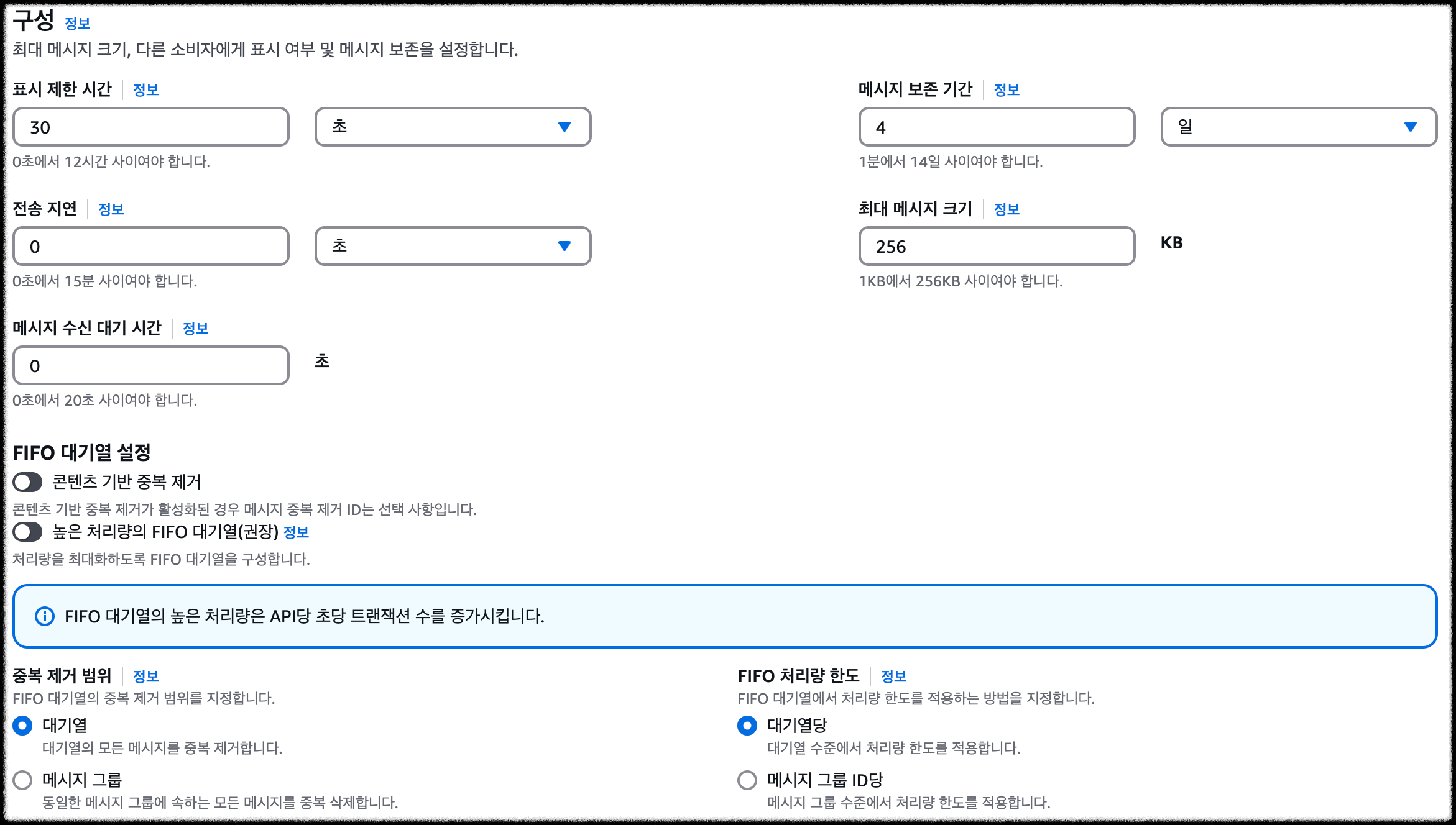 - 전송 지연 : 대기열에 메시지가 추가되었을 때 소비되는 시간 (0초 : 즉시 소비)