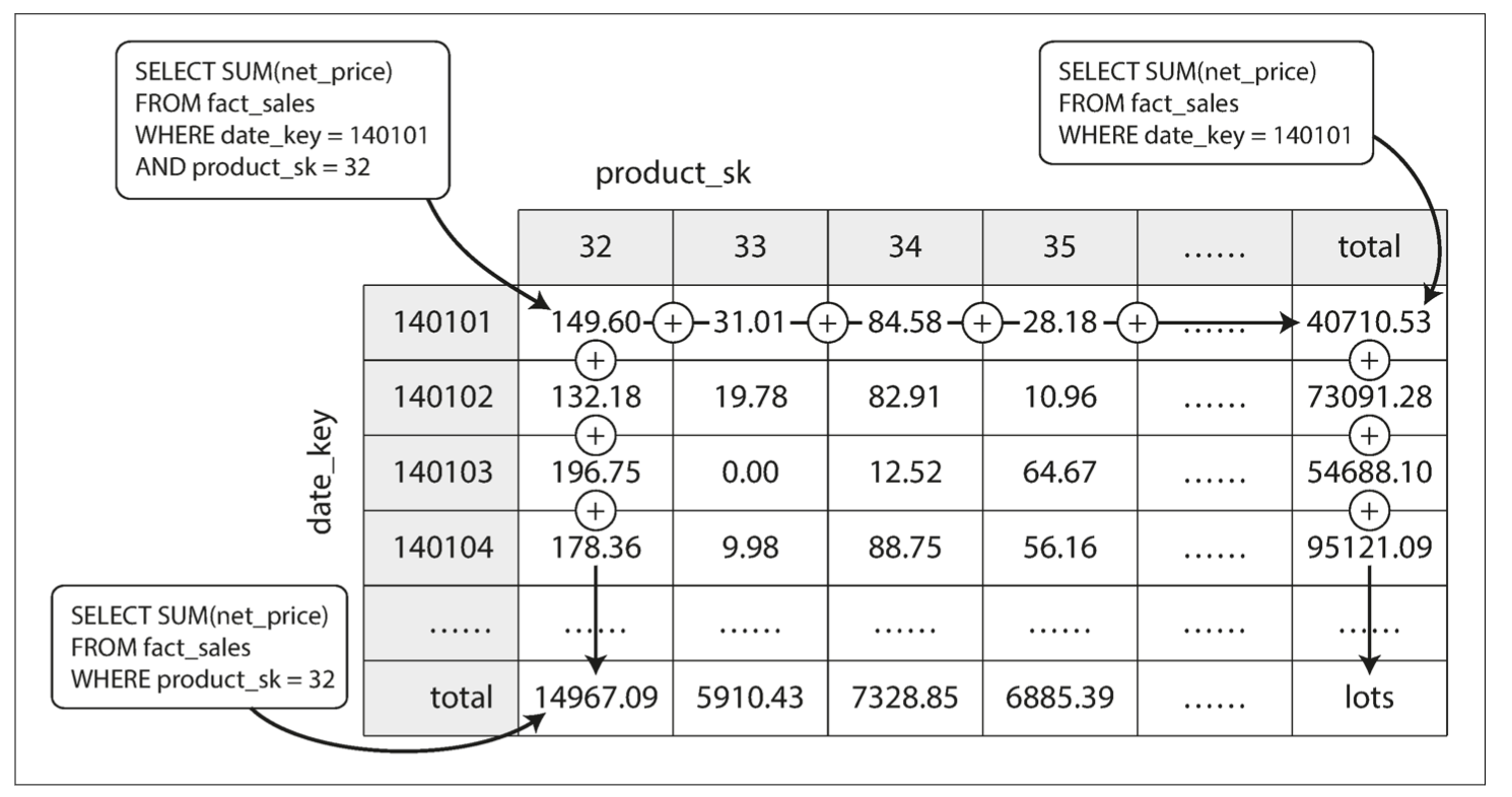 - 각 셀은 날짜와 제품을 결합한 모든 사실의 속성(net_price)의 집계(sum) 값을 포함함.