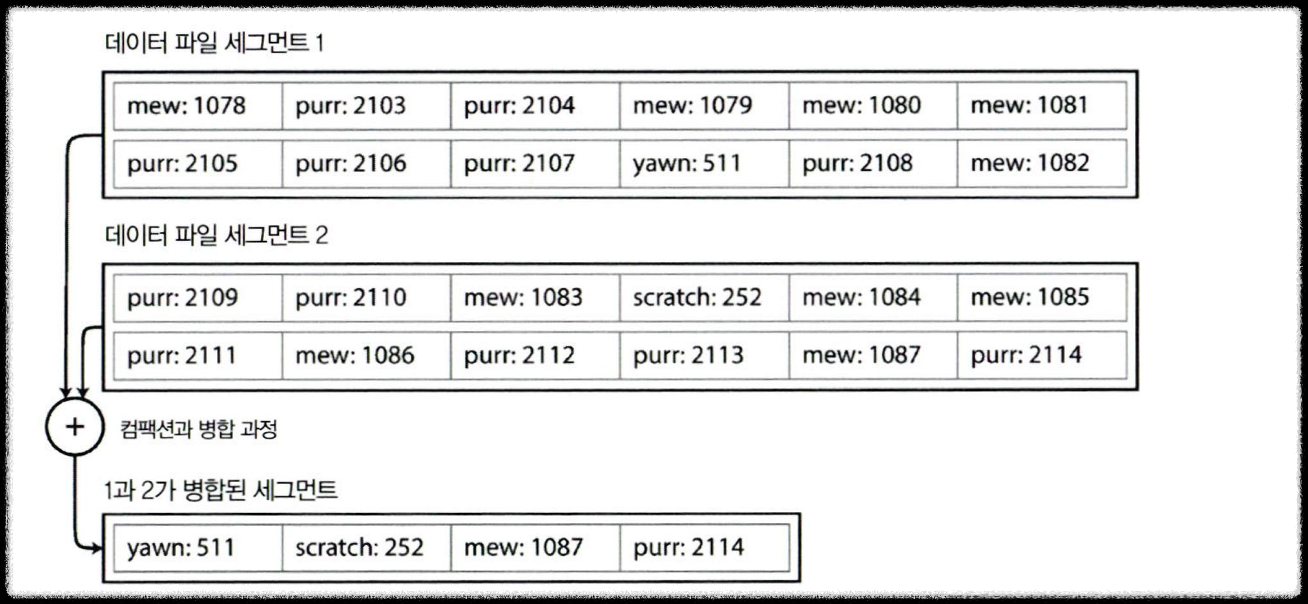 - 특정 크기의 세그먼트로 로그를 나누기 & 컴팩션(compaction)
