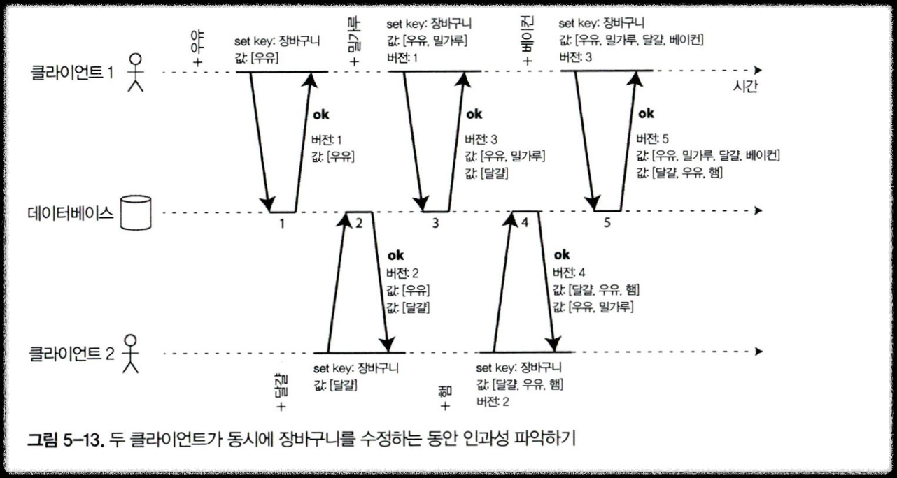 - 처음에 장바구니는 비어 있고, 두 클라이언트가 데이터베이스에 쓰기를 다섯 번 수행함.