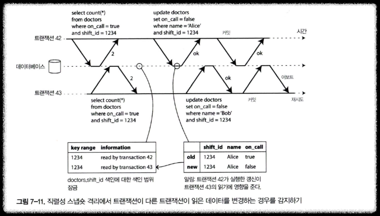 - 직렬성 격리를 쓰는 DB는 팬텀을 막아야 함.