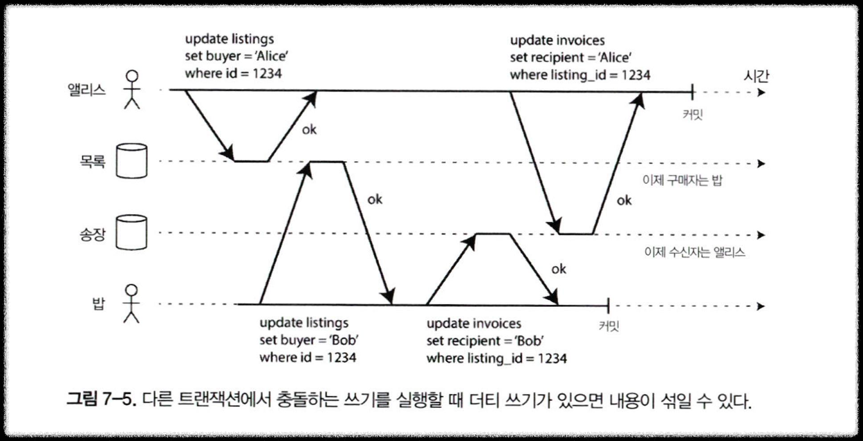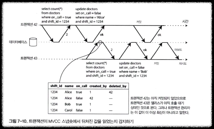 - 트랜잭션이 커밋하려고 할 때, DB는 무시된 쓰기 중에 커밋된게 있는지 확인해야 함.