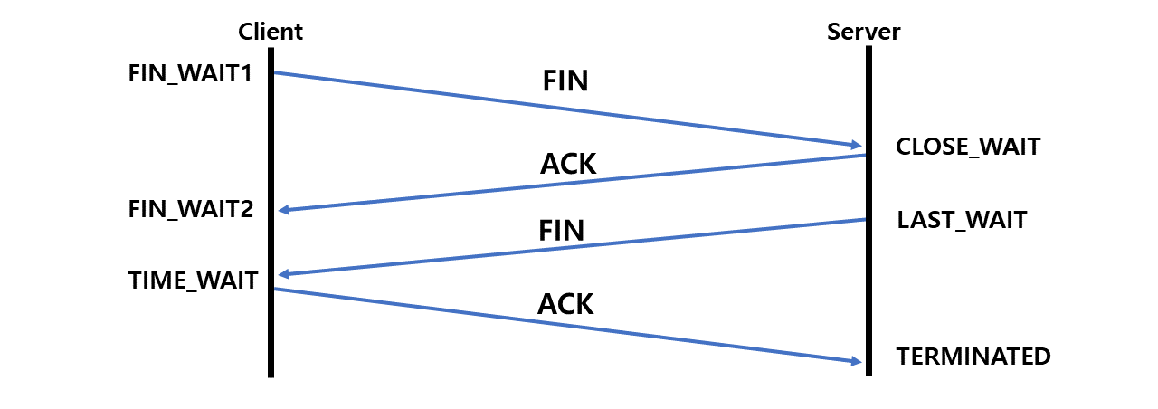 클라이언트는 TIME_WAIT 상태가 되고 다시 서버로 ACK를 보내면 서버는 CLOSED 상태가 된다.