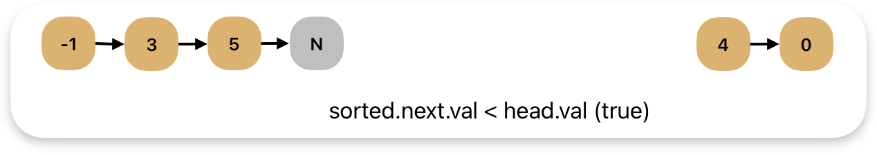 위 경우와 같이 `sorted.next.val = 3` 이 정렬되어야 할 `head.val = 4` 보다 작은 경우에는 다음과 같이
